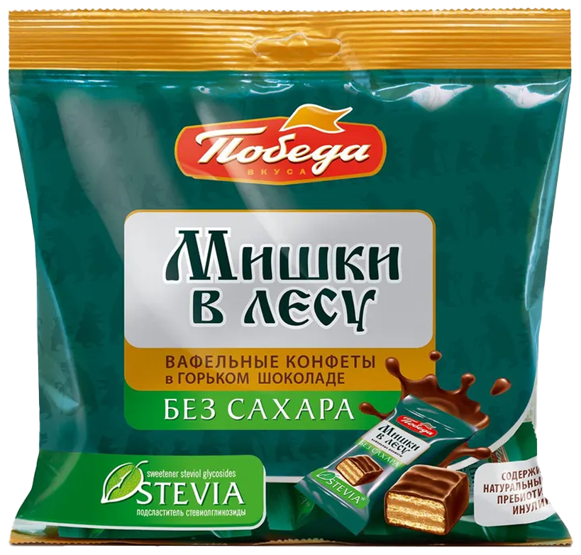 Победа Конфеты вафельные без сахара "Мишки в лесу" в горьком шоколаде, 150 грамм